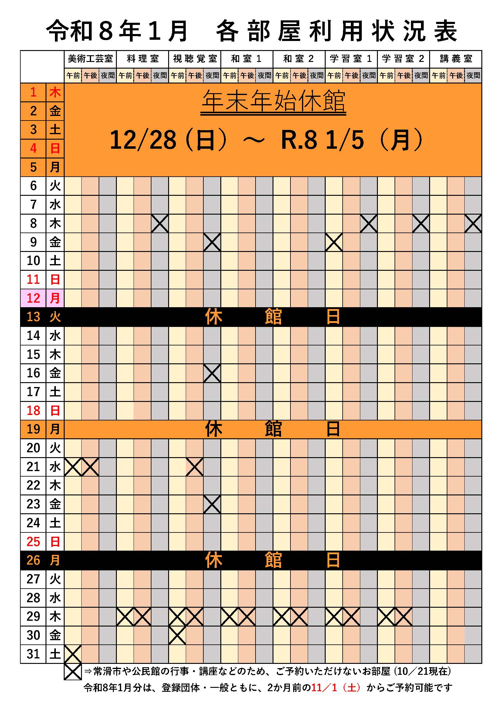 公民館ではまもなく11/1(土)より、「来年1月分」のお部屋の予約受付けが始まります。