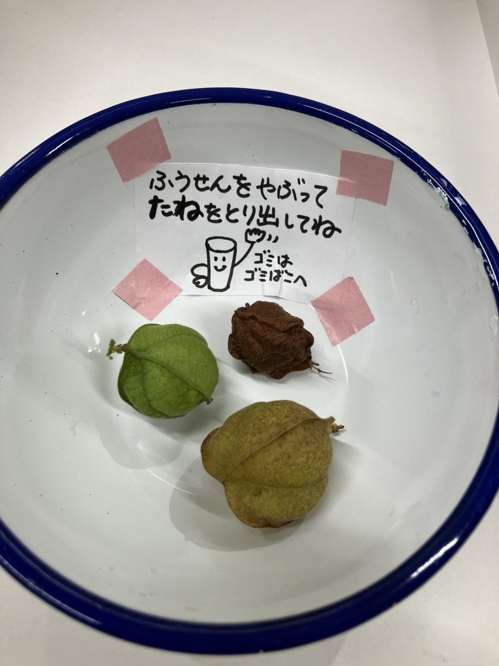 青海公民館で育てていた「ふうせんかずら」のたねを「ふうせん」から取り出してみましょう。
