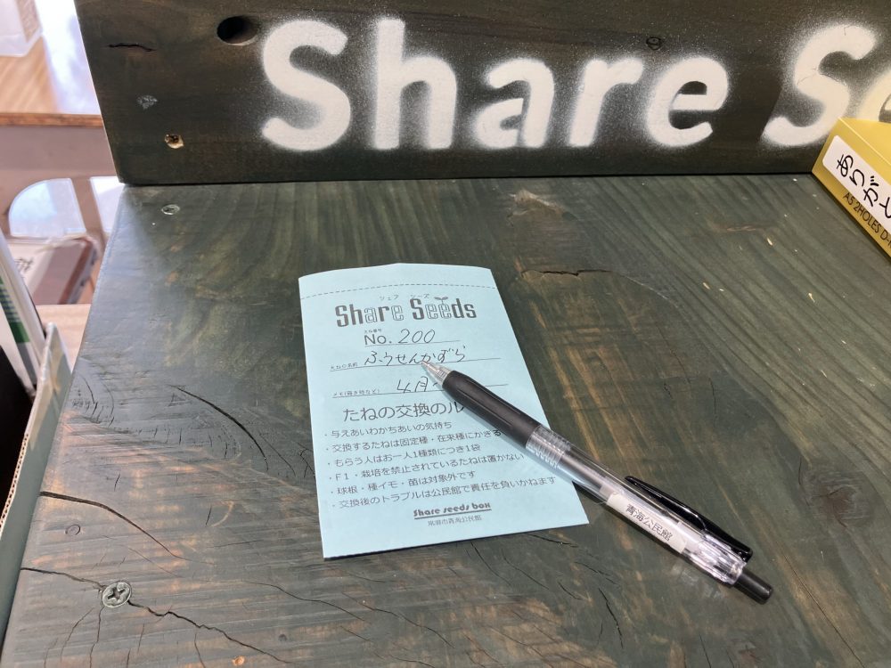 たねをお持ち帰りになる方は、どうぞシェアシーズボックスの「たね袋」に入れてお持ちくださいね。