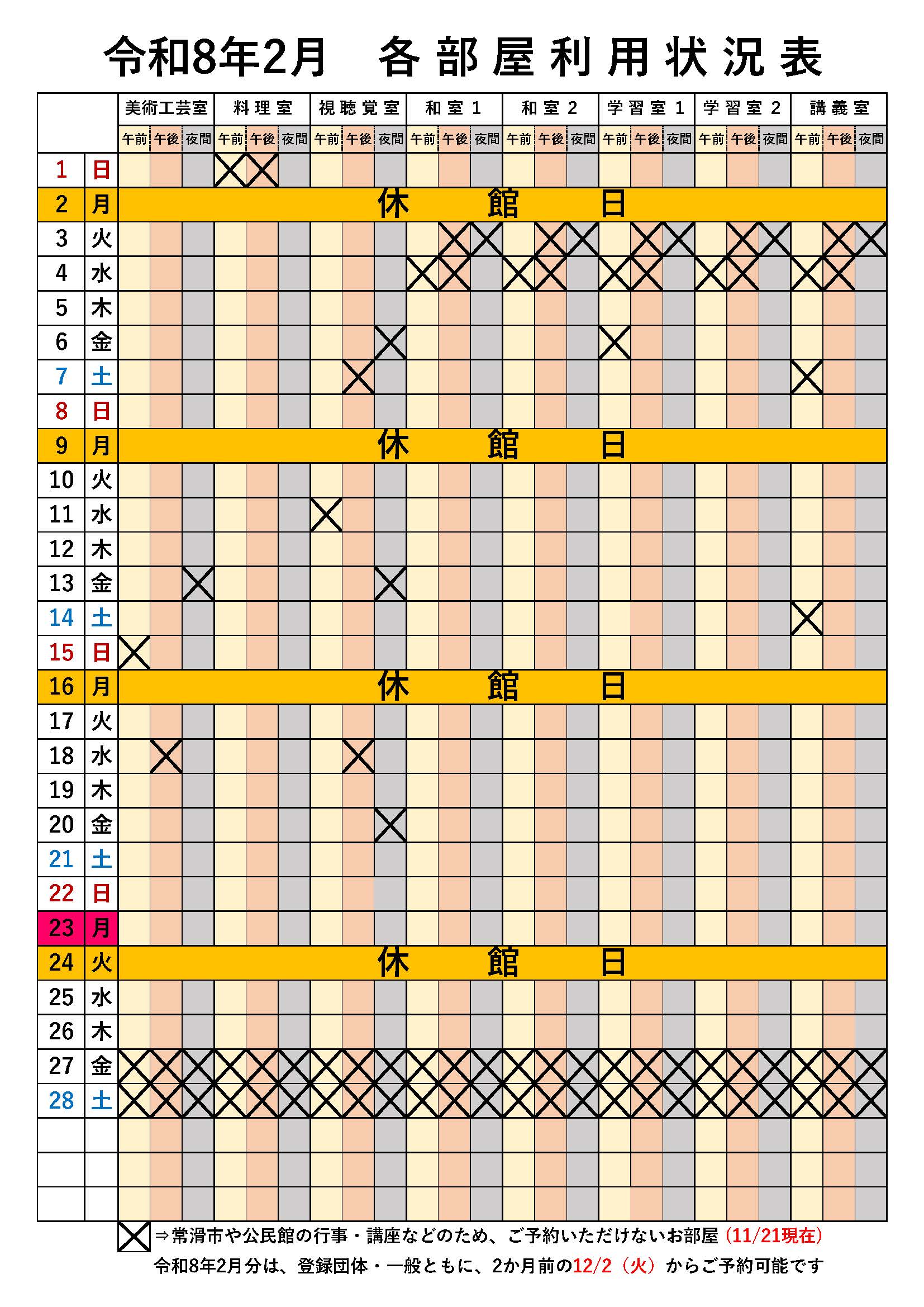 令和8年2月の各部屋利用状況表(11月21日現在)