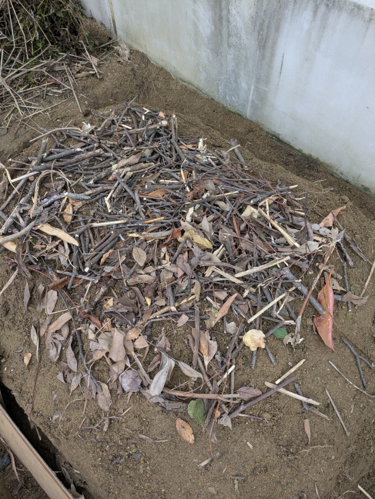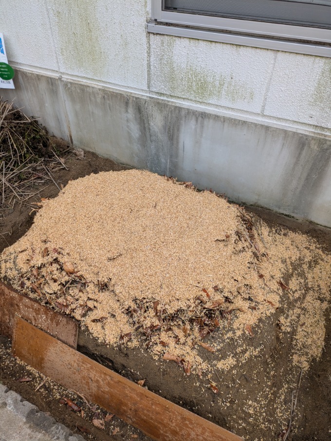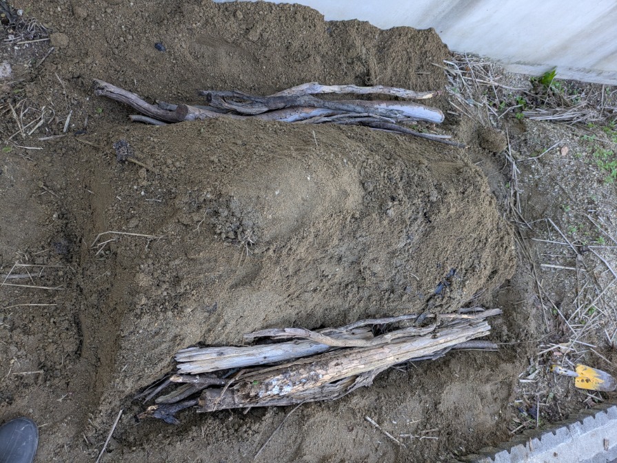 木の枝などに付着した糸状菌たち(菌ちゃん)に有機物を分解してもらって土作りする農法です。作業の最後に畝に手を当てて「菌ちゃん、ありがとう!よろしくね!」と声をかけました。